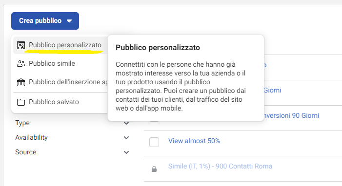 3. Clicca su Crea Pubblico e scegli Pubblico Personalizzato