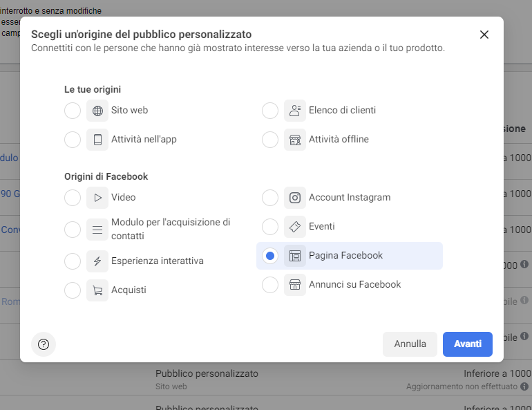 4. Quando si aprirà il Pop-Up, per scegliere l'origine del pubblico, scegli Pagina Facebook.