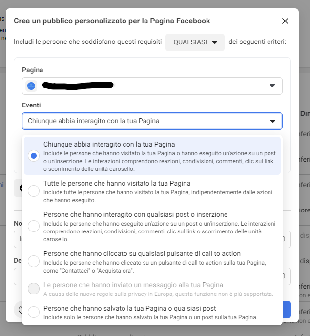 5. A questo punto hai diverse possibilità di creare il tuo pubblico ma ti consigliamo di scegliere "Chiunque abbia interagito con la tua Pagina", mentre per i giorni in cui vuoi includere questo pubblico lasciali ampi. 365 vanno benissimo.