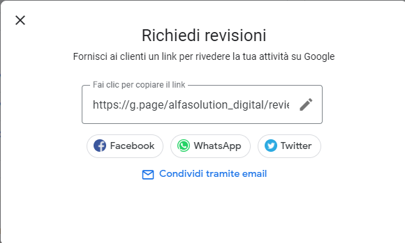 Su Facebook è molto più semplice: basta copiare l'indirizzo nella pagina "Recensioni" della tua Fanpage e poi allegarlo nella mail, sms o push che invierai al cliente.